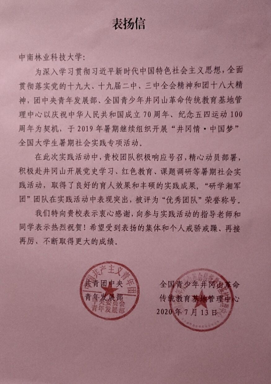 为庆祝中华人民共和国成立70周年、纪念五四运动100周年,团中央青年发展部、全国青少年井冈山革命传统教育基地管理中心组织展开“井冈情·中国梦”全国大学生暑期社会实践专项活动。中南林业科技大学旅游学院“研学湘军团”团队在该活动中表现突出,被评为“优秀团队”荣誉称号。