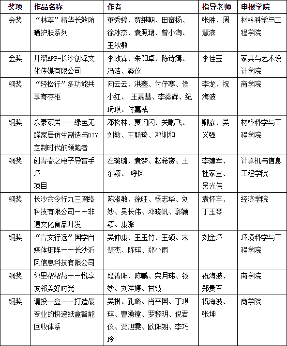 5月26日至28日,“创青春”湖南省大学生创业大赛终审决赛在长沙举行。我校入围的9件作品全部获奖,共斩获金奖2项,铜奖7 项,并获得“优秀组织奖”。