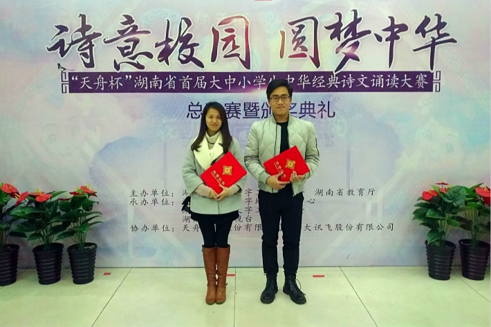 12月27日晚,“天舟杯”湖南省首届大中小学生“中华经典诗文诵读大赛”总决赛暨颁奖典礼在湖南教育电视台举行。在此次活动中,校团委广泛发动师生积极参与,经过组织校级经典诗文诵读大赛,从中推选了两件作品参赛。由校党委宣传部刘金环老师和校团委梁茜薇老师指导的作品《礼仪之邦》在复赛中获三等奖,《中国少年说》获优胜奖。这项活动引领了广大同学诵读经典、热爱经典,增强了对中华传统文化的自信。
