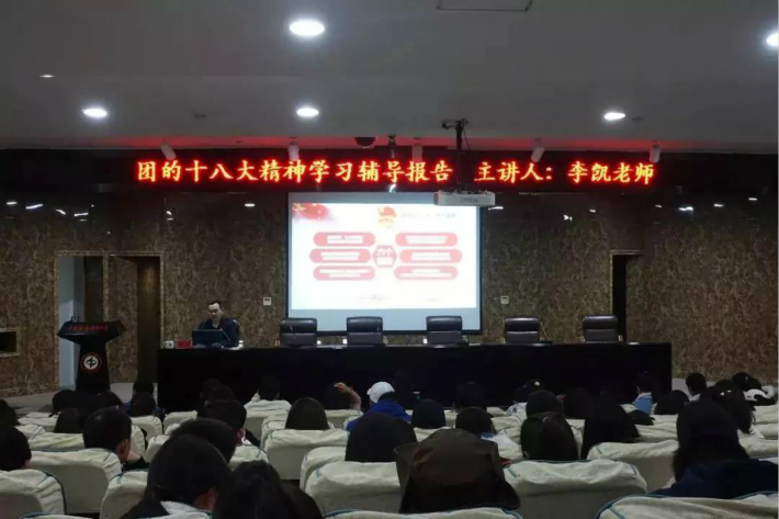 李凯老师先从“七二重要讲话”入手,然后从团十八大大会概括、中央致词、报告解读与修改团章等方面介绍了团十八大的基本情况。他着重讲解了十八大的背景和主题、党中央对广大青年的五点希望、第十七届中央委员会工作报告、关于中国共青团改革的七个方面并对过去五年工作进行了回顾。对于如何建设共青团,他表明:不仅要从严治党,也要从严治团。不仅政治上要严,团干部队伍建设要严,团员队伍建设也要严。除此之外,李凯老师多次引用习总书记关于青年论述的金句,语重心长地教导所有团员青年坚定信念,脚踏实地奋斗。抓住人生机遇,放飞青春理想。