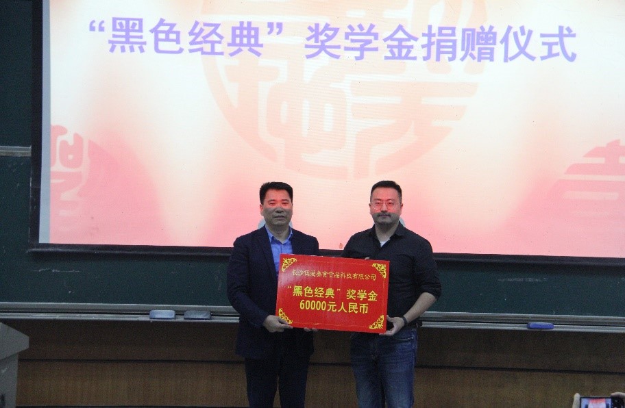 会上,校企双方举行了“黑色经典奖学金”的捐赠仪式,长沙伍爱美食公司出资6万元,在学院设立“黑色经典奖学金”,将帮助到更多的学生实现自己的梦想。