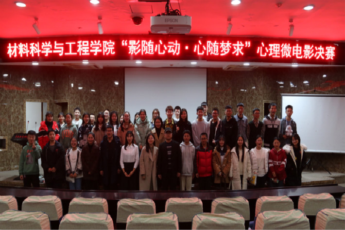 12月13日晚7点,材料学院于图书馆报告厅举行第五届“影随心动·心随梦求”心理微电影大赛决赛。担任此次决赛的评委有材料学院团委书记李斯老师、辅导员管姮雁老师、第十四届团委学生会主席团书记处成员。此次活动由材料学院心理部干事陈龙、牛婧怡主持。