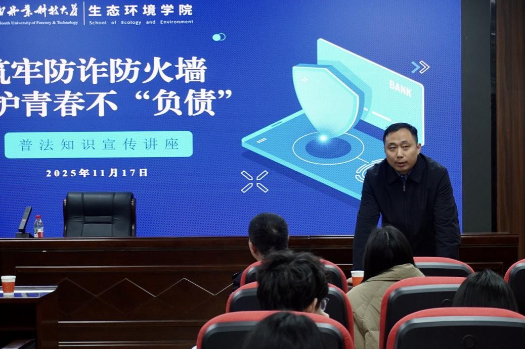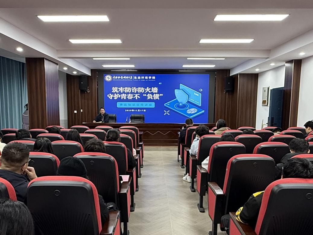 为进一步提升学生防诈骗意识,营造安全、和谐、稳定的校园环境。11月17日,生态环境学院联合文源派出所于树木楼A504报告厅举办了主题为“筑牢防诈防火墙,守护青春不‘负债’”的普法知识宣传讲座。会议特别邀请了文源派出所所长刘谋千,为学院学生系统宣讲防诈反诈知识。学校后勤保障部(保卫工作部)部长张双利、学院党委副书记贺显军、学院全体辅导员、学生干部参加,会议由贺显军主持。