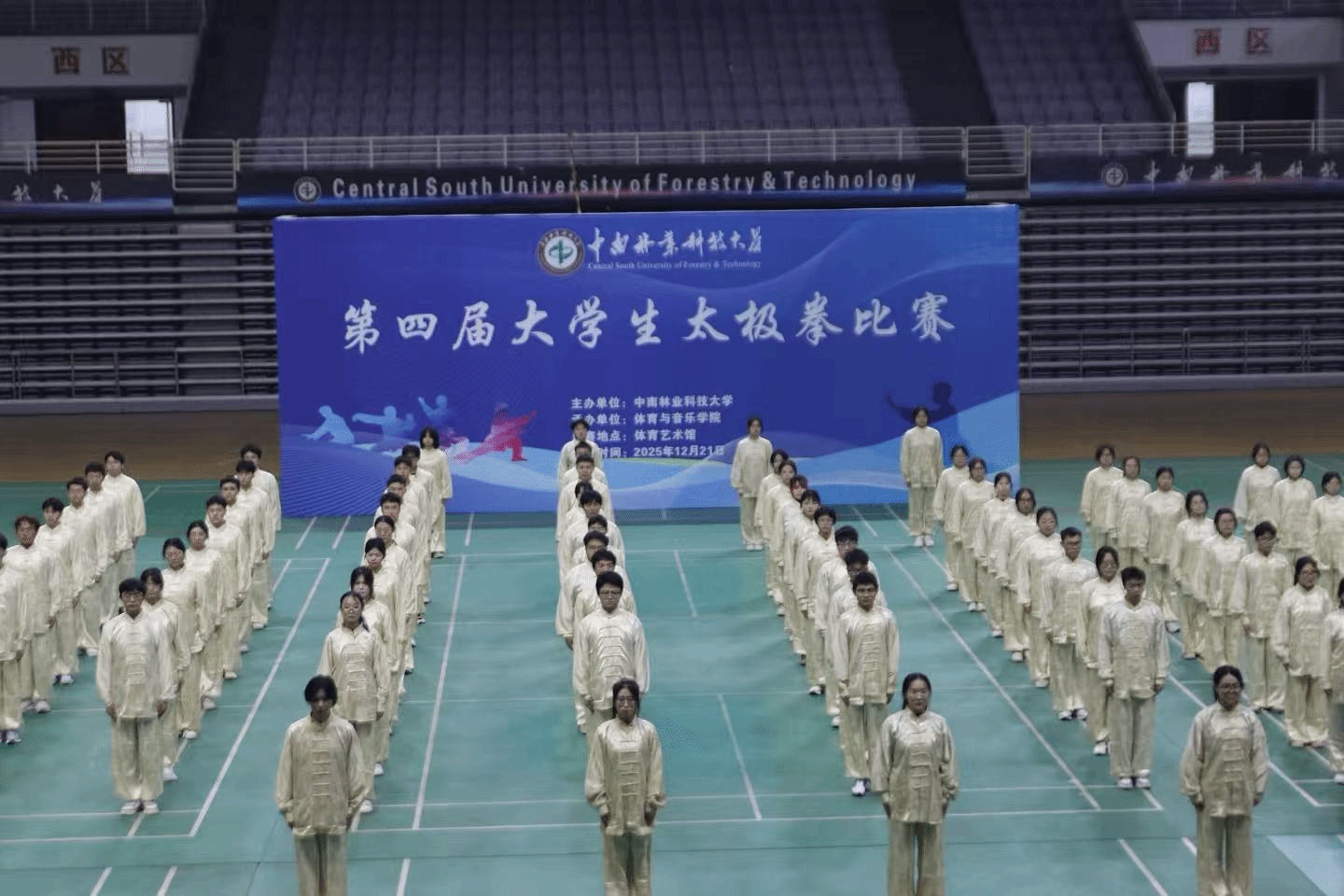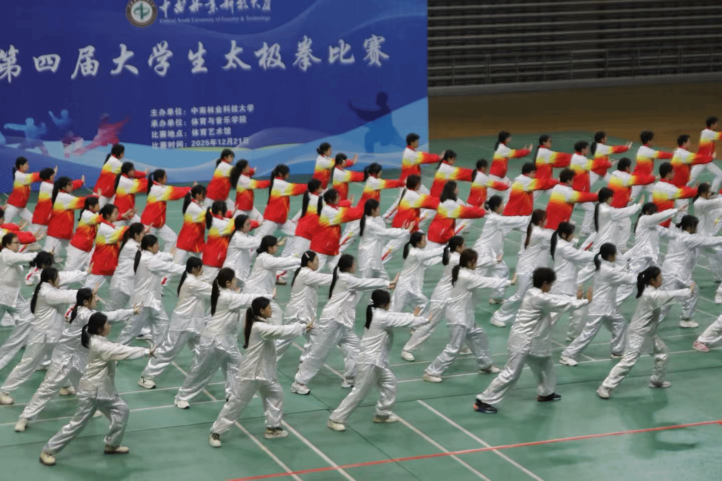 12月21日,中南林业科技大学第四届大学生太极拳比赛在体育艺术馆正式开幕。本次赛事由中南林业科技大学主办,体育与音乐学院承办,以弘扬中华优秀传统文化、增强大学生民族自信、展现体育课堂教学成果为宗旨,吸引了全校20个学院的1887名2025级本科生参与,赛事分为团体赛与个人赛两大类别。