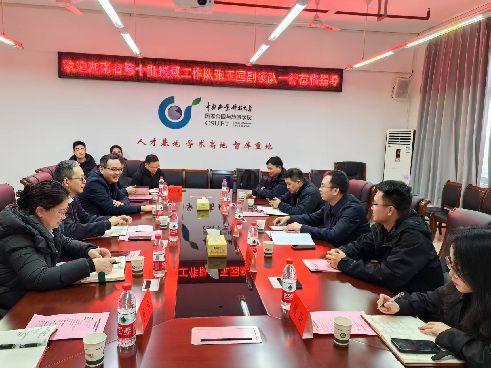 为贯彻落实中央第四次对口援藏工作座谈会精神,进一步加强人才援藏和校地合作,受山南市委副书记、常务副市长,湖南省第十批援藏工作队领队白云峰委托,副领队、山南市委组织部副部长张玉园近日来国家公园与旅游学院调研交流。学校党委组织部常务副部长龙壮志、招生就业处处长李凯、学院副院长(主持工作)罗芬、党委副书记张卓以及援藏师生代表出席座谈会,学院党委书记洪梅主持会议。