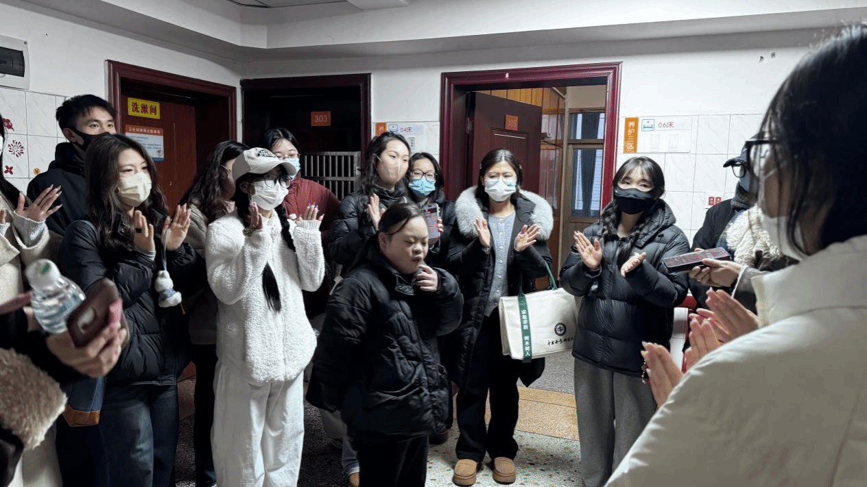 随后,刘菁老师和学生们还前往住宿区看望了一些无法自理或参加劳动的残疾人。在这里,我们遇到了一位热情乐观的小姐姐,工作人员介绍说她非常喜欢唱歌。刘菁老师当即提议让这位小姐姐为大家表演一个节目,她爽快地答应了,深情演唱《我和我的祖国》。虽然她的歌声并不完美,但她的真情深深打动了在场的每一个人,大家情不自禁地打起拍子并为她伴唱,表演完之后大家为她鼓掌,给她点赞。